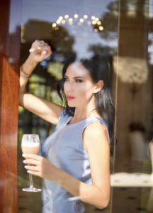 Beautiful Irina wearing drapped champagne dress in 100% silk, with golden leavers lace, decorated with thousands of crystals by hand. And heavenly blue crepe silk dress with a sensual opened back. Shooting took place in magical Hotel du Cap Eden Roc, Antibes.