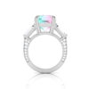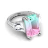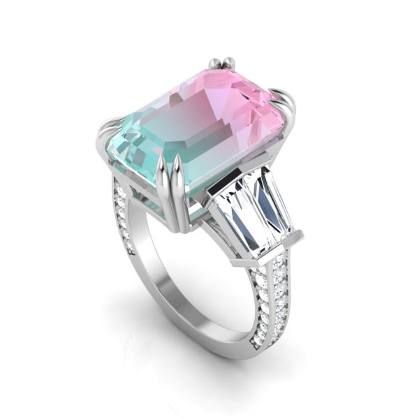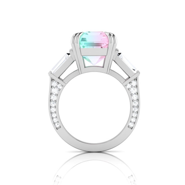 8ct beautiful baby bi-color natural, certified tourmaline in a 18k white gold ring with excellent quality 4 tapered baguette diamonds on two sides.
