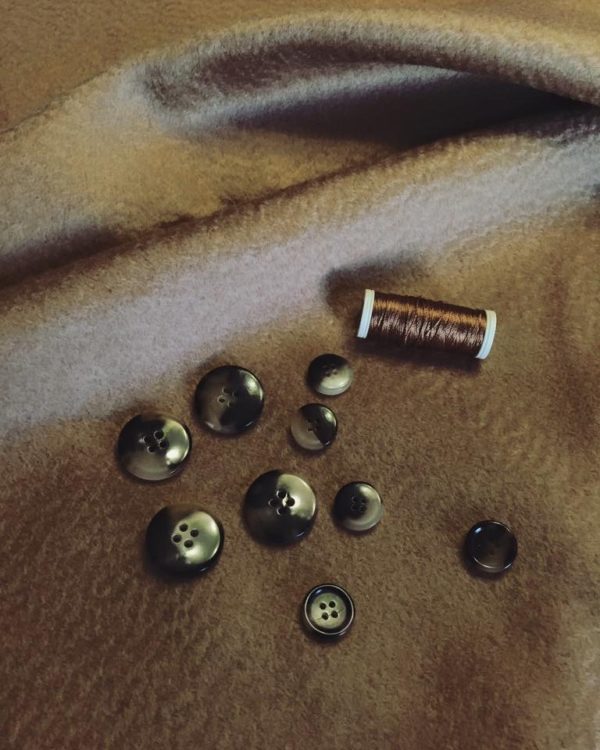 Its a dream pure cashmere coat. Silk crepe lining and mother of pearl buttons. Hand stitched with silk decorative cord. Dry clean only.