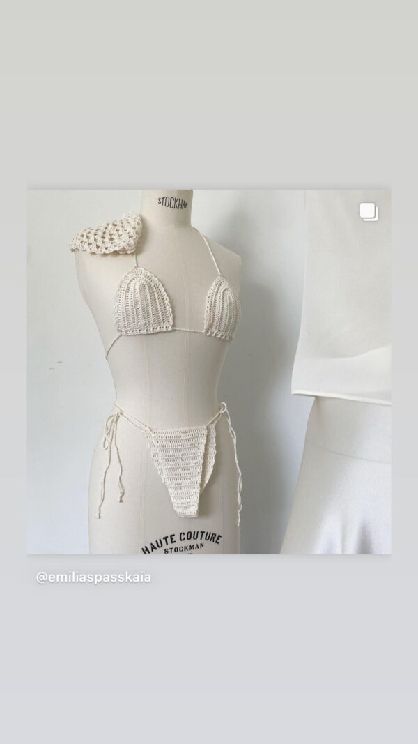 Hand knitted body with a crochet hook, togeather with Swarovski crystals. Sexy high leg cut and laces to tighten the body from behind. Hand wash.