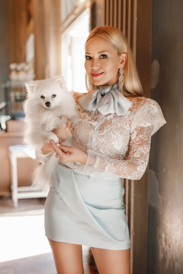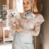 Handcrafted crepe satin blouse with an opened back, silk buttons and decorated with precious chocolate chantilly lace. Dry clean only Flowers are by The Dolder Grand Hotel