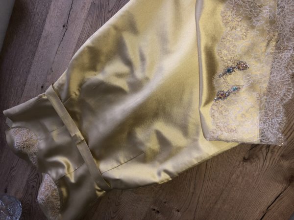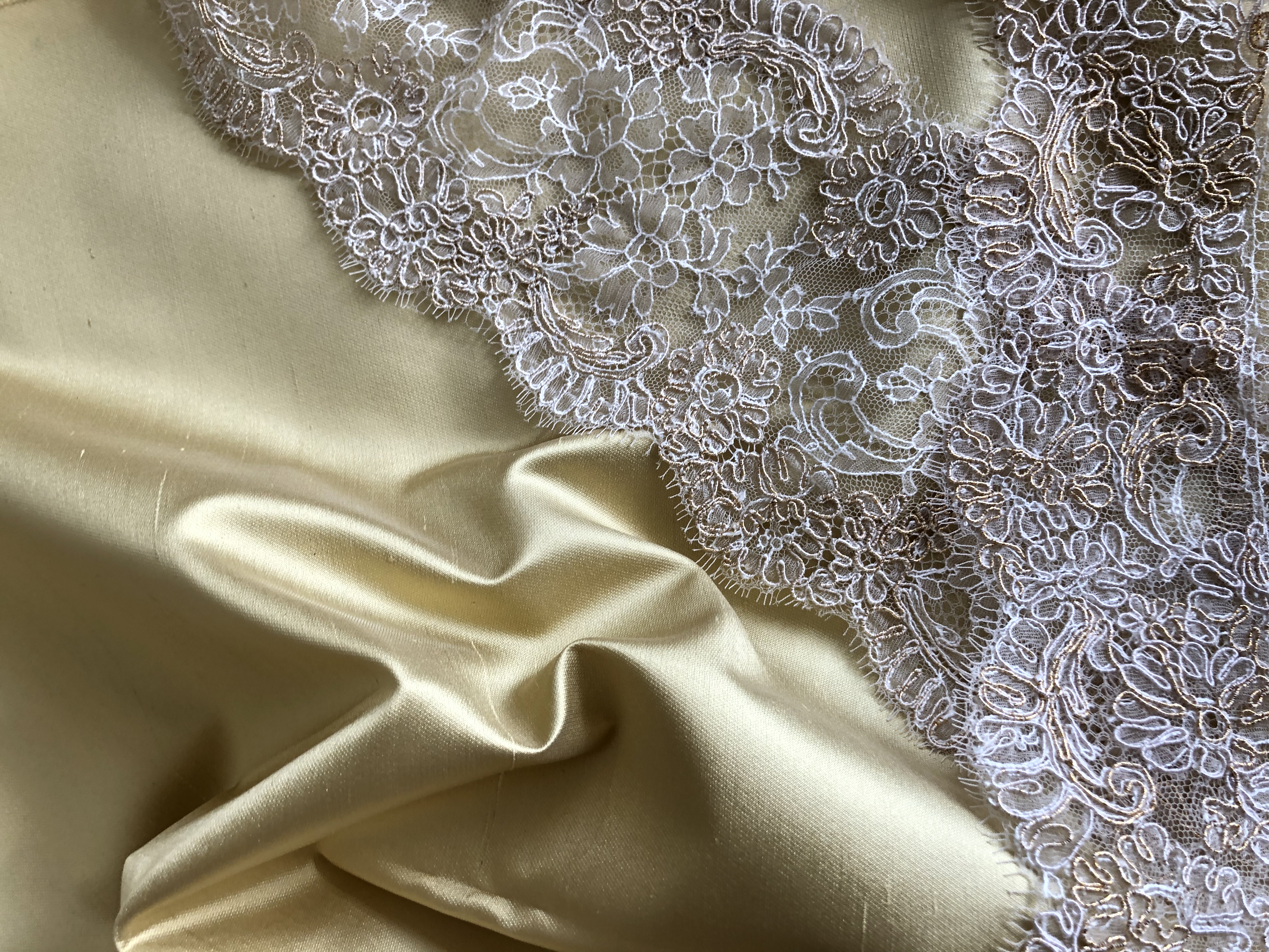 100% silk taffeta dress with leavers lace decoration. Handcrafted in Zurich, Switzerland