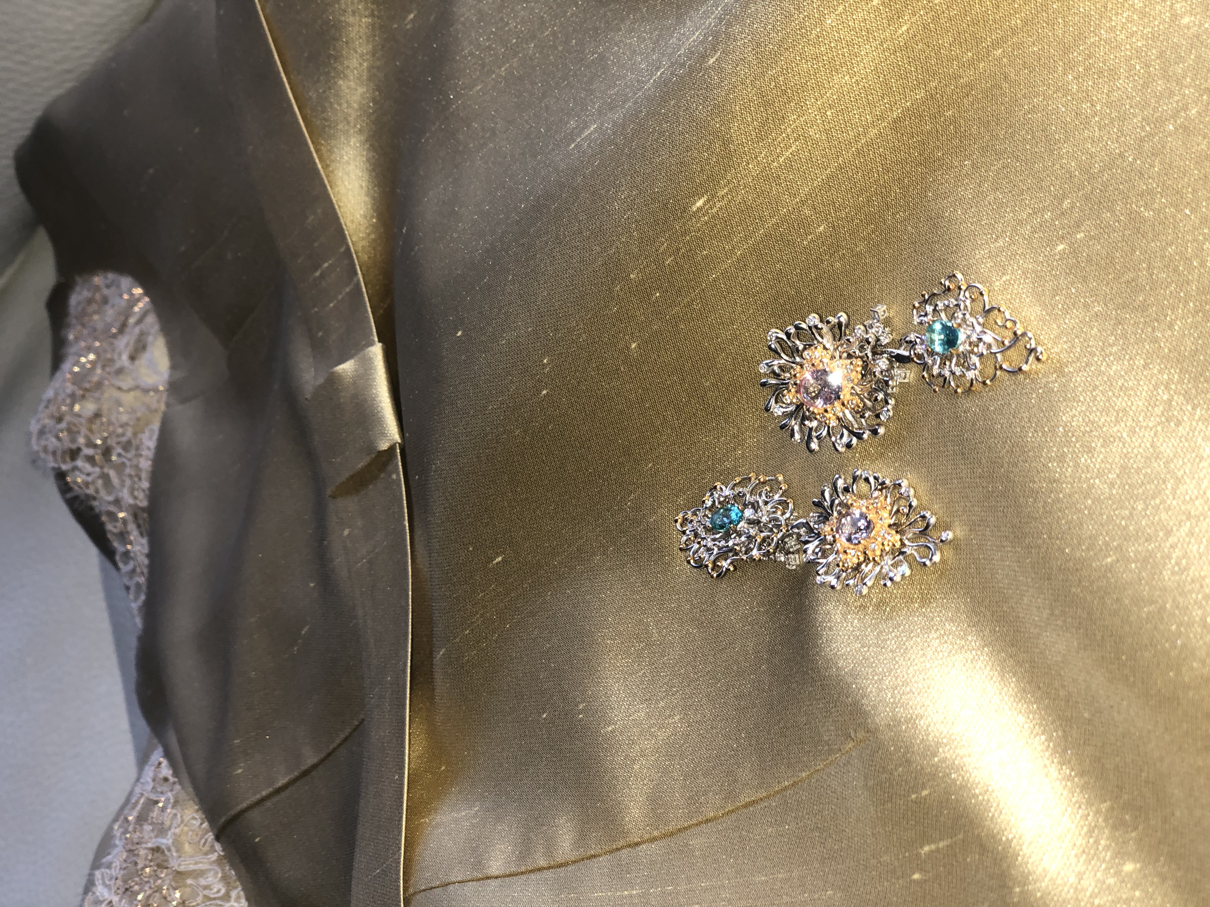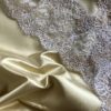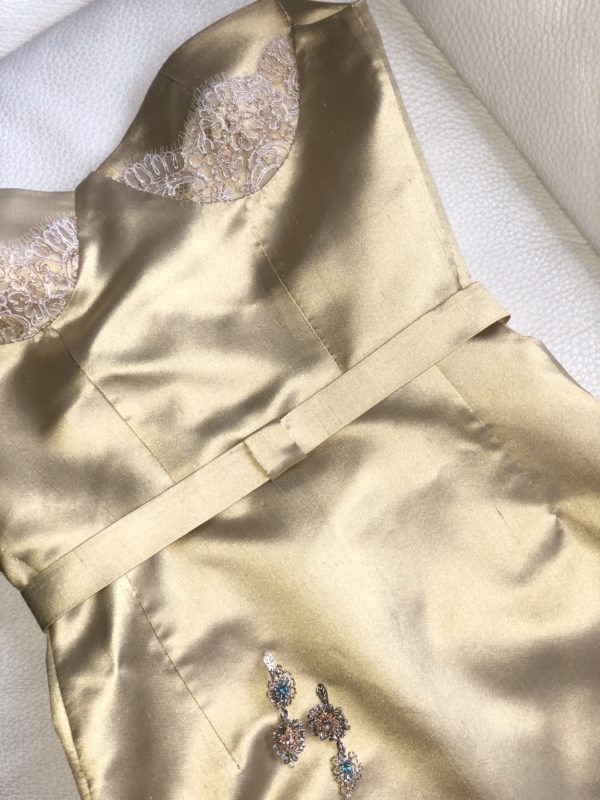 Classic french lace dress with a touch of golden Swarovski crystals and buttons. Golden silk lamé waist. Hand work.