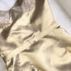 One of the kind. Made to measure silk crepe dress in champagne color. It is decorated with silk corded precious lace and handcrafted silk buttons. Our best seller this summer