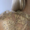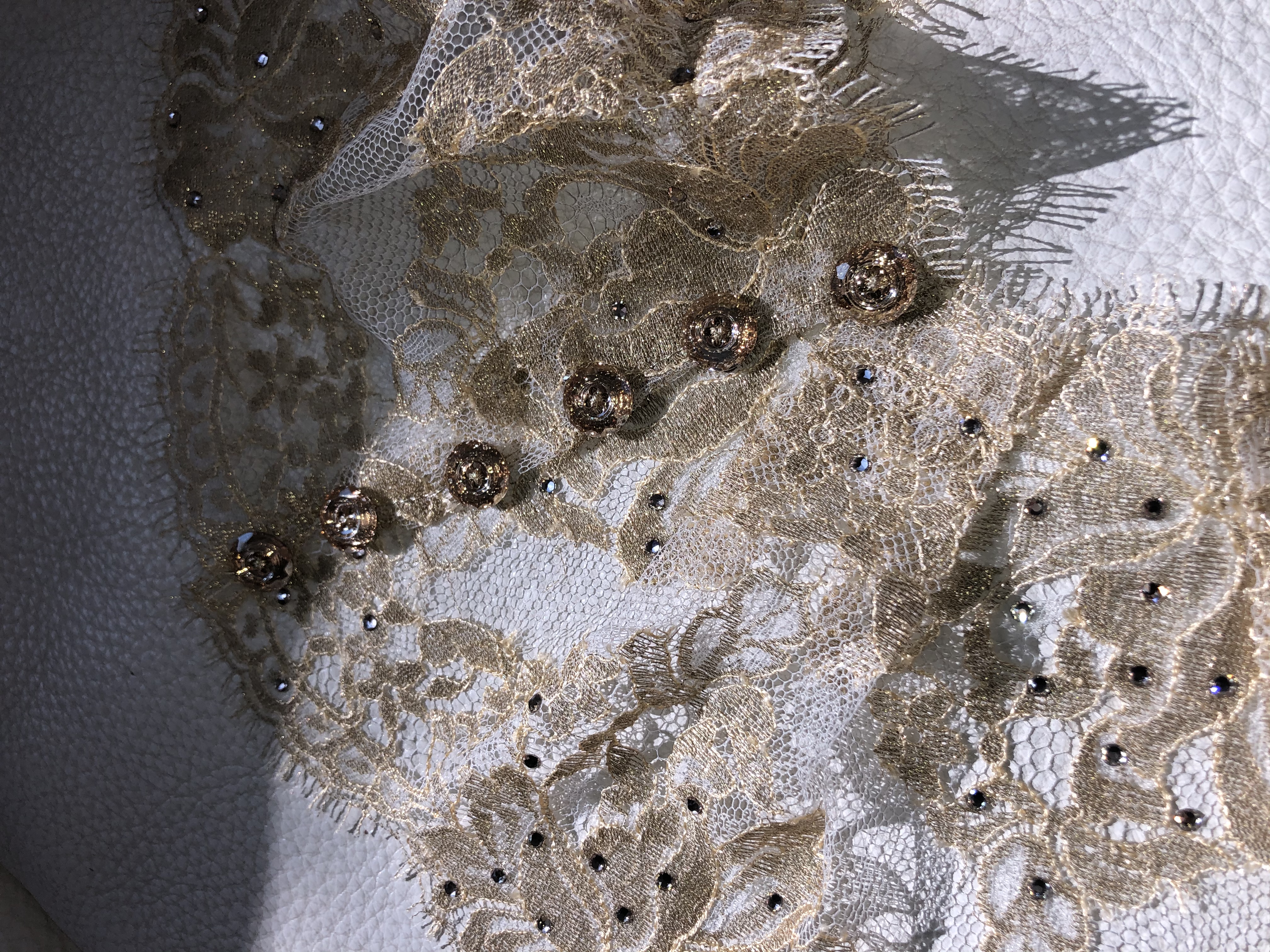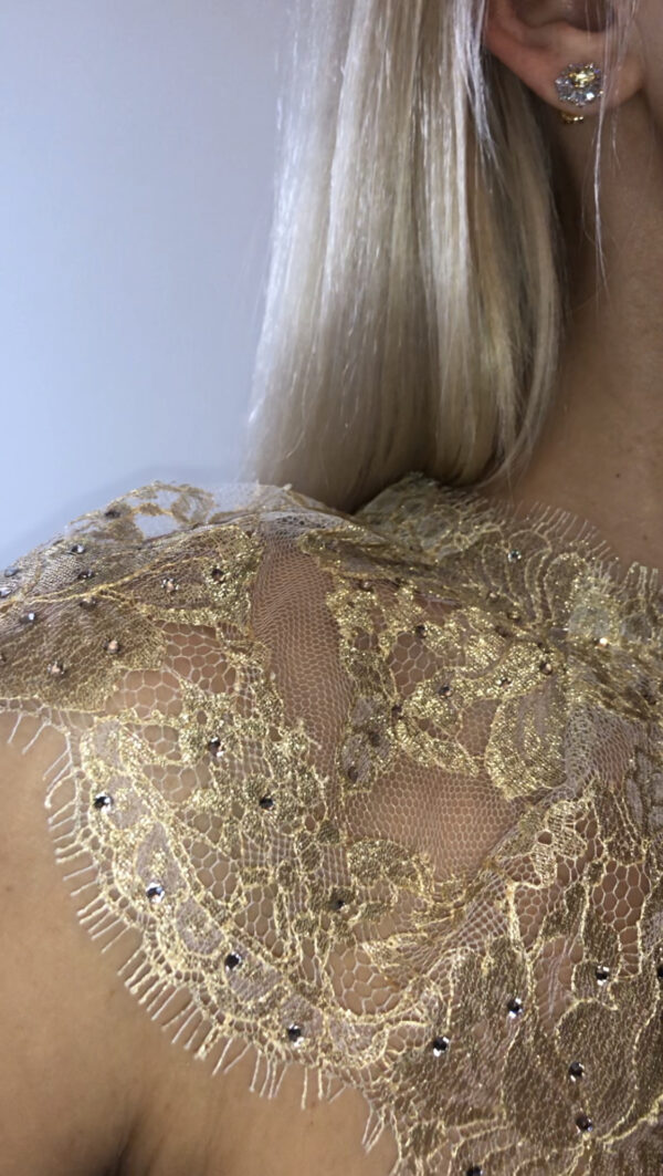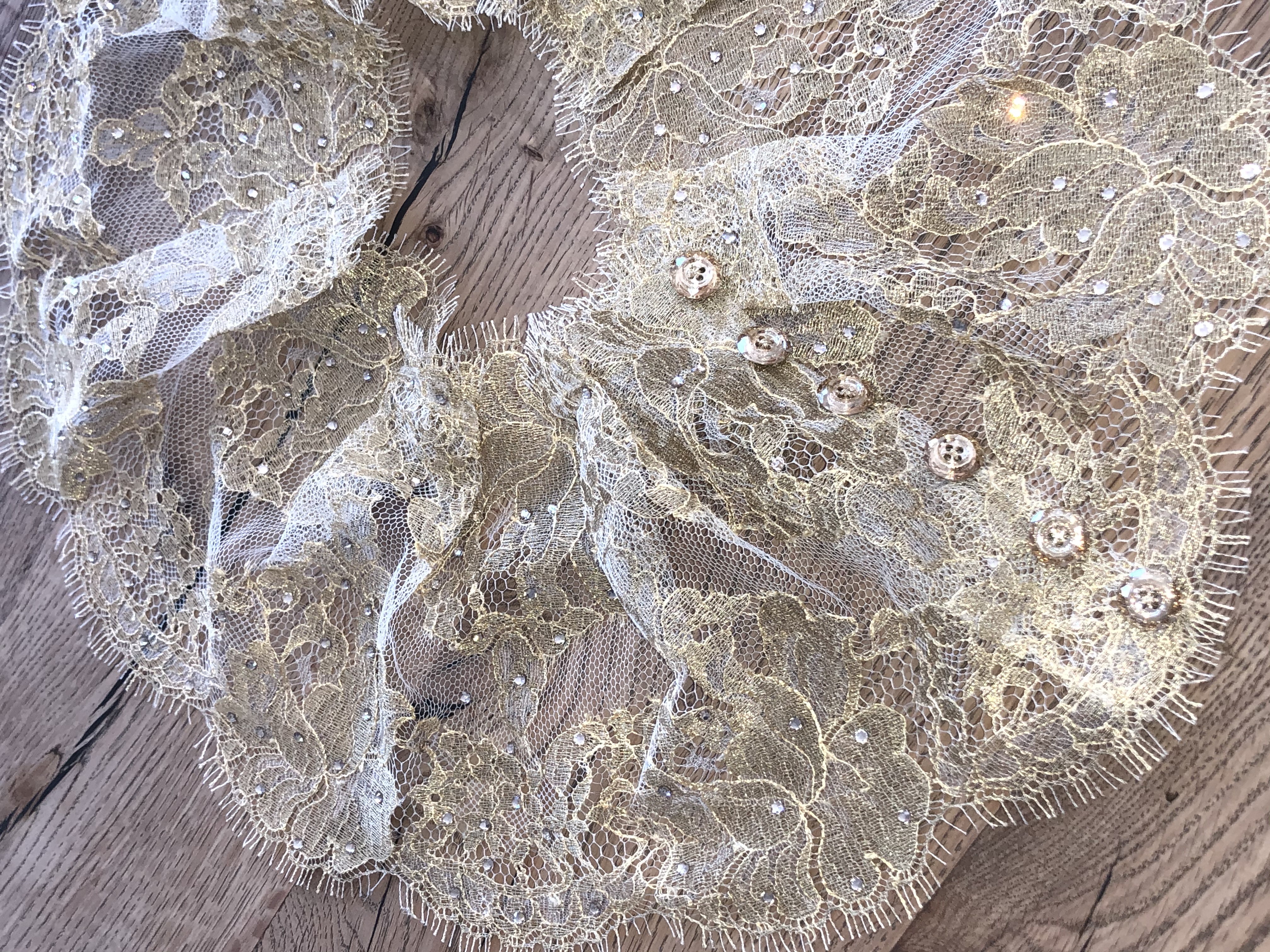 Traditional chantilly gold lace with Swarovski crystals decor by hand, Swarovski golden shadow crystal buttons.