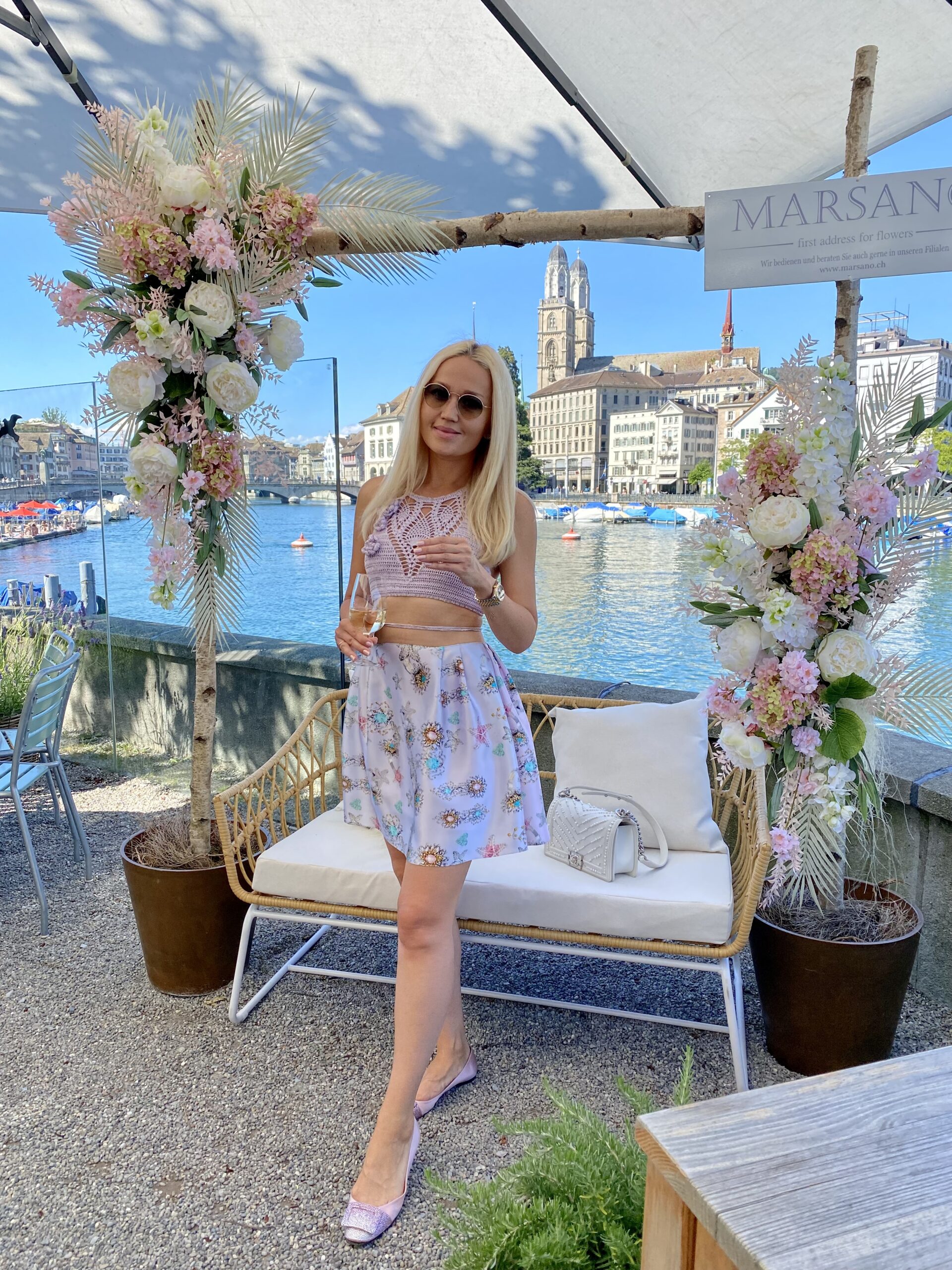 Haute-couture, hand knitted, crochet silk dress in beautiful ice-cream color, decorated with 25000 Swarovki crystals and hand knitted Sakura flowers. Copyright 2020