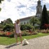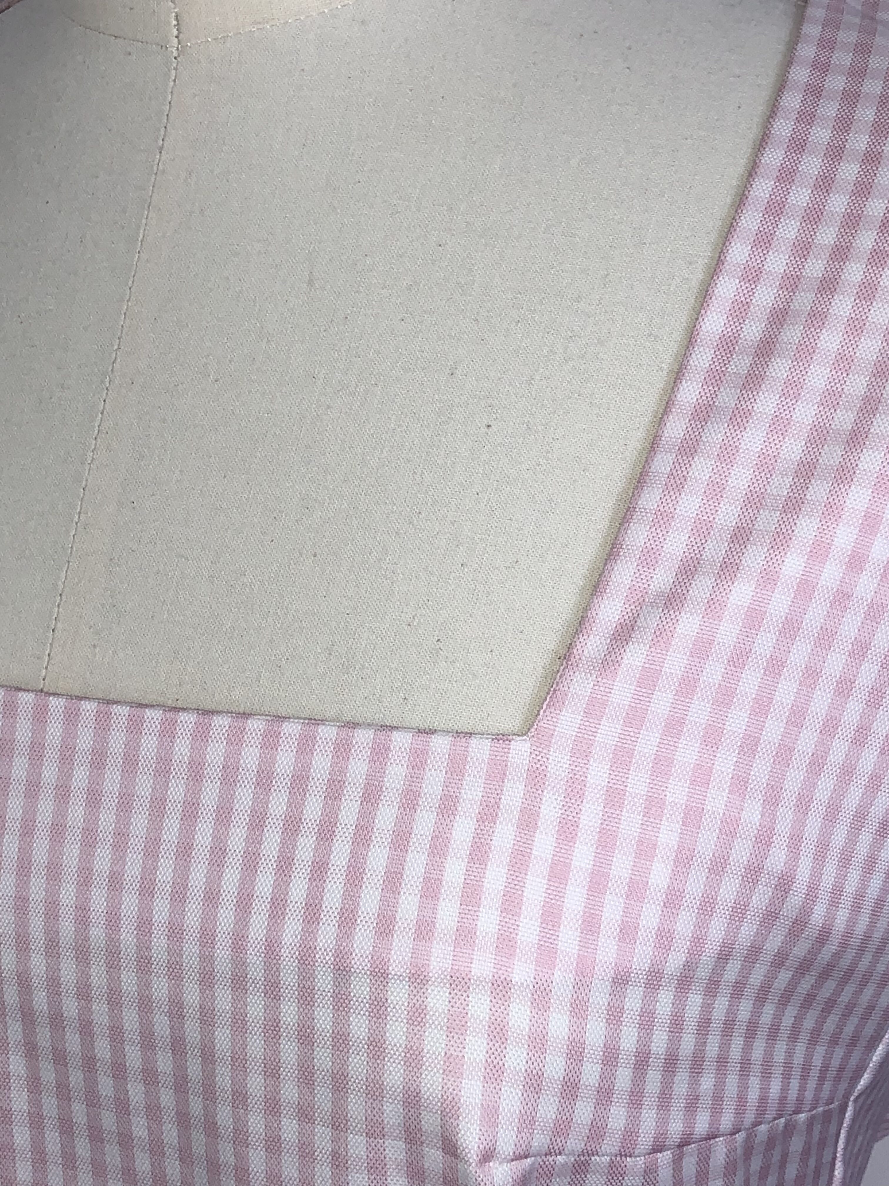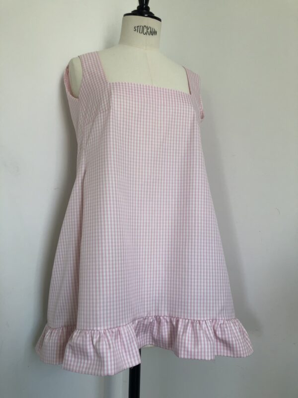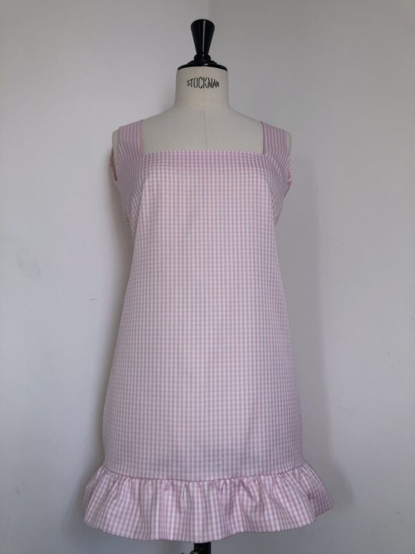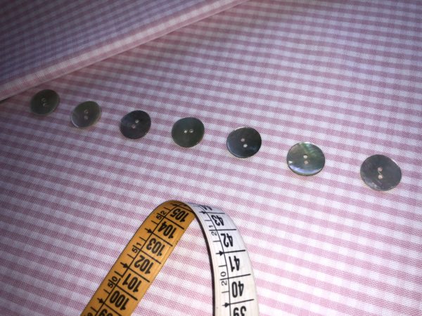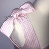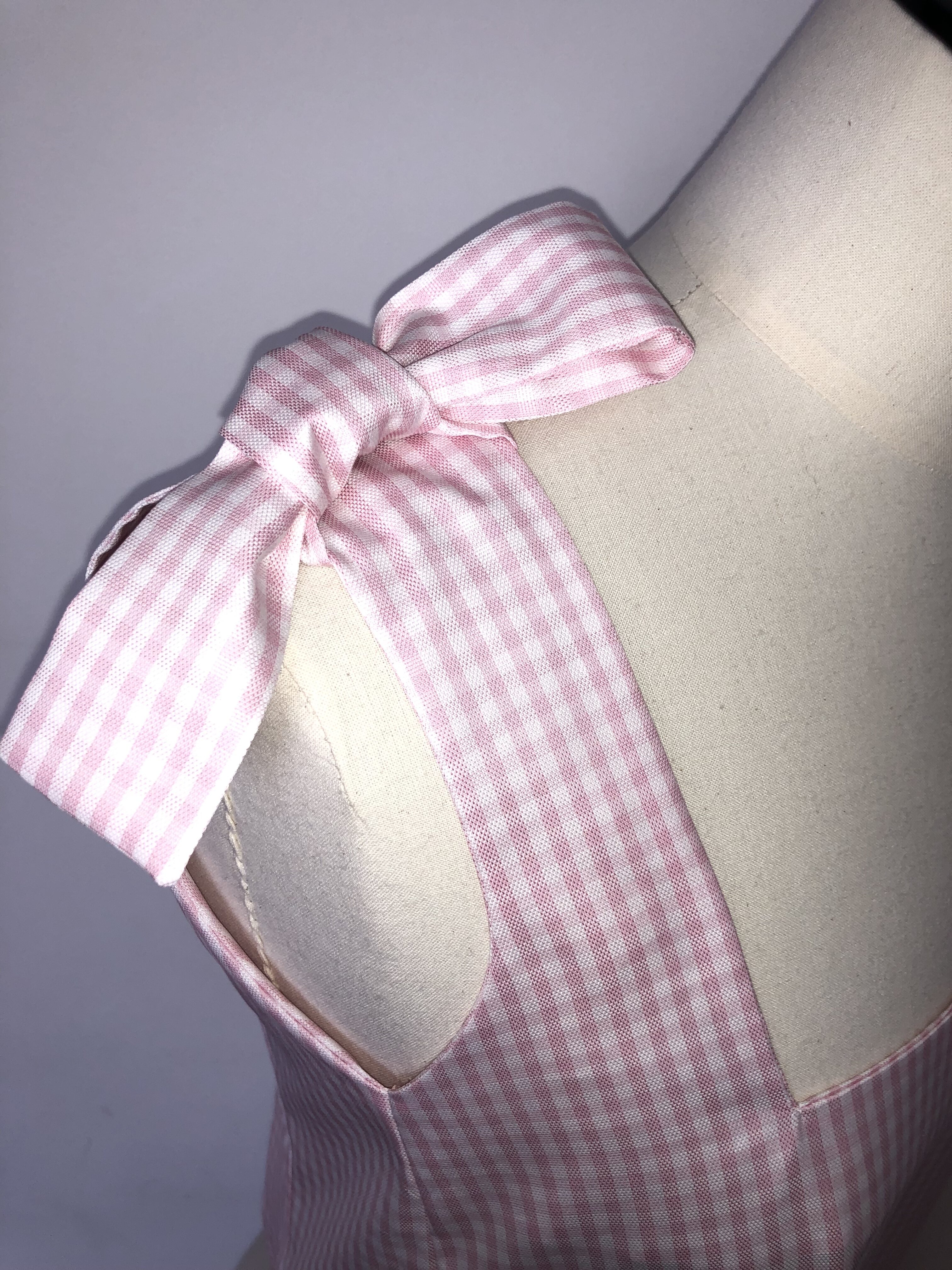 Finest swiss cotton mixed linen used for this cute summer, handcrafted dress with buttons in mother of pearl and swiss bows. Opened V back.