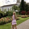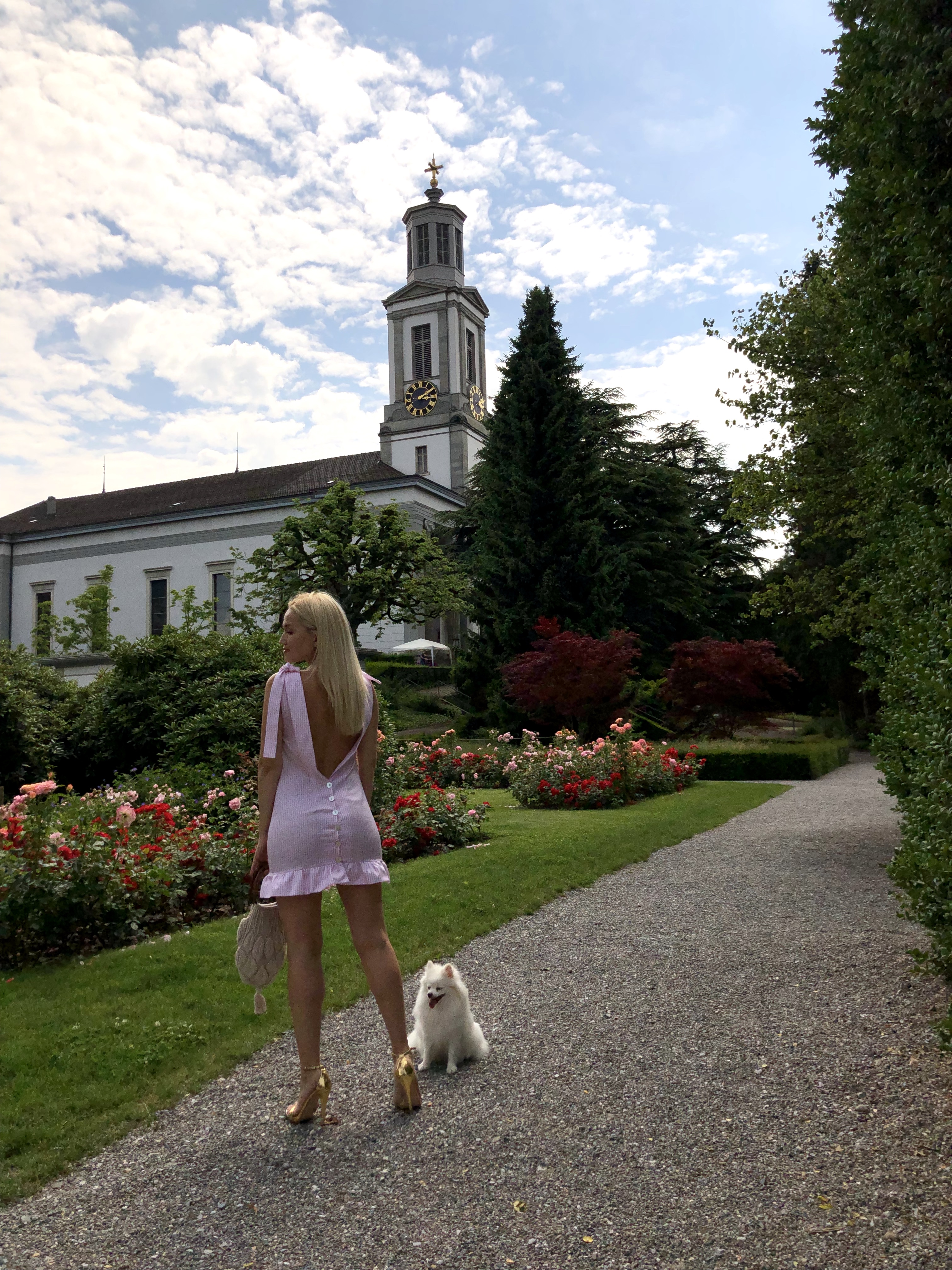 Two matching evening dresses. Light pink organza dress with flower silk tulle turtle neck dress. Handcrafted. Exclusive. Made in Switzerland. Dry clean only.
