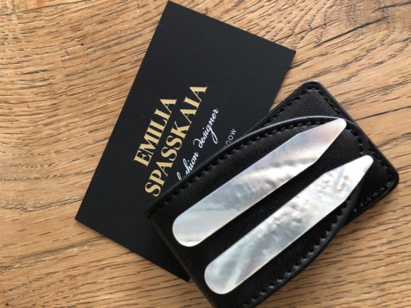 Natural mother of pearl collar stands for men’s shirt in a nice leather case. Handcrafted.