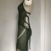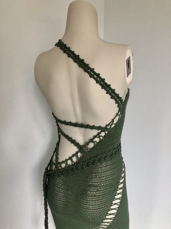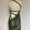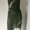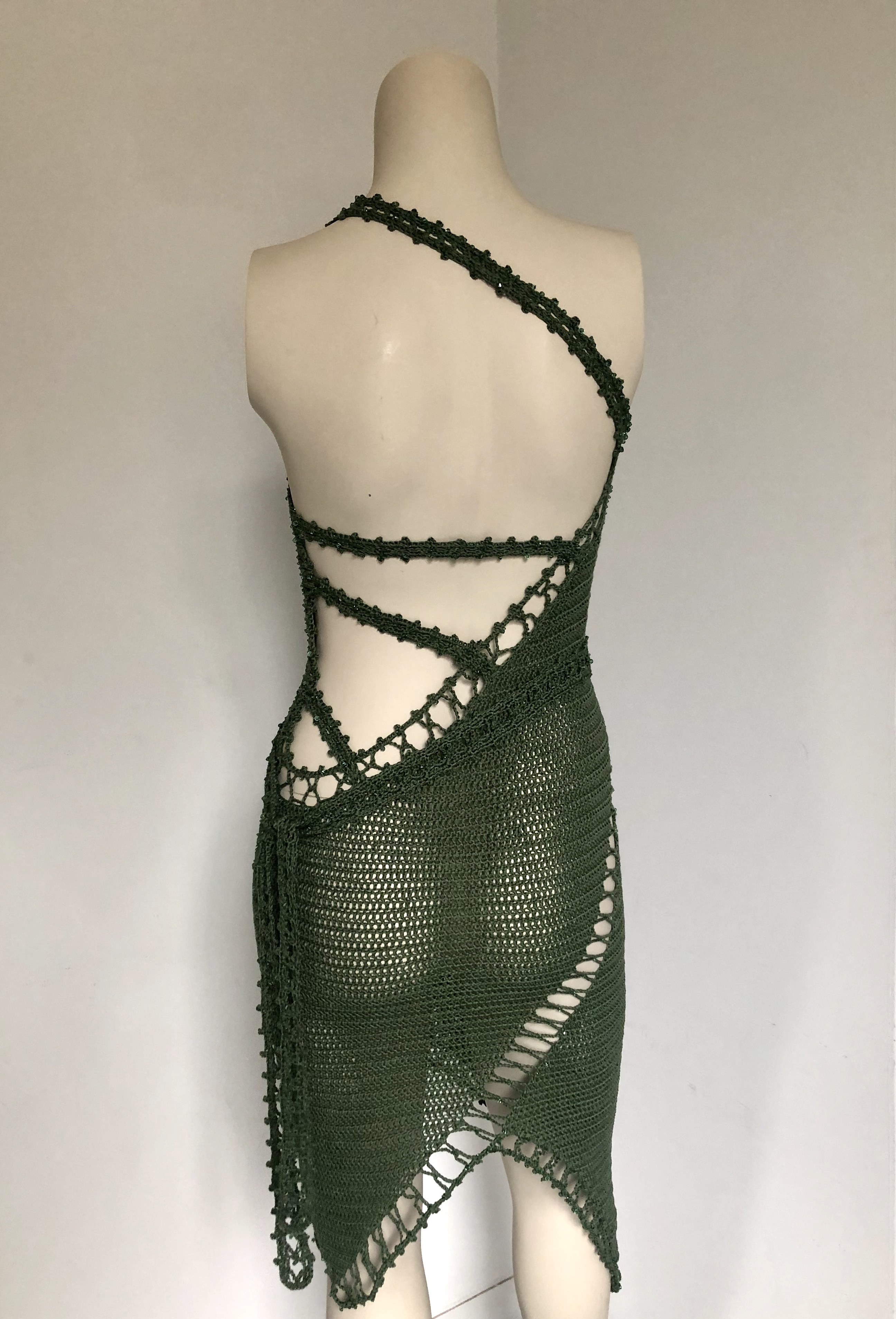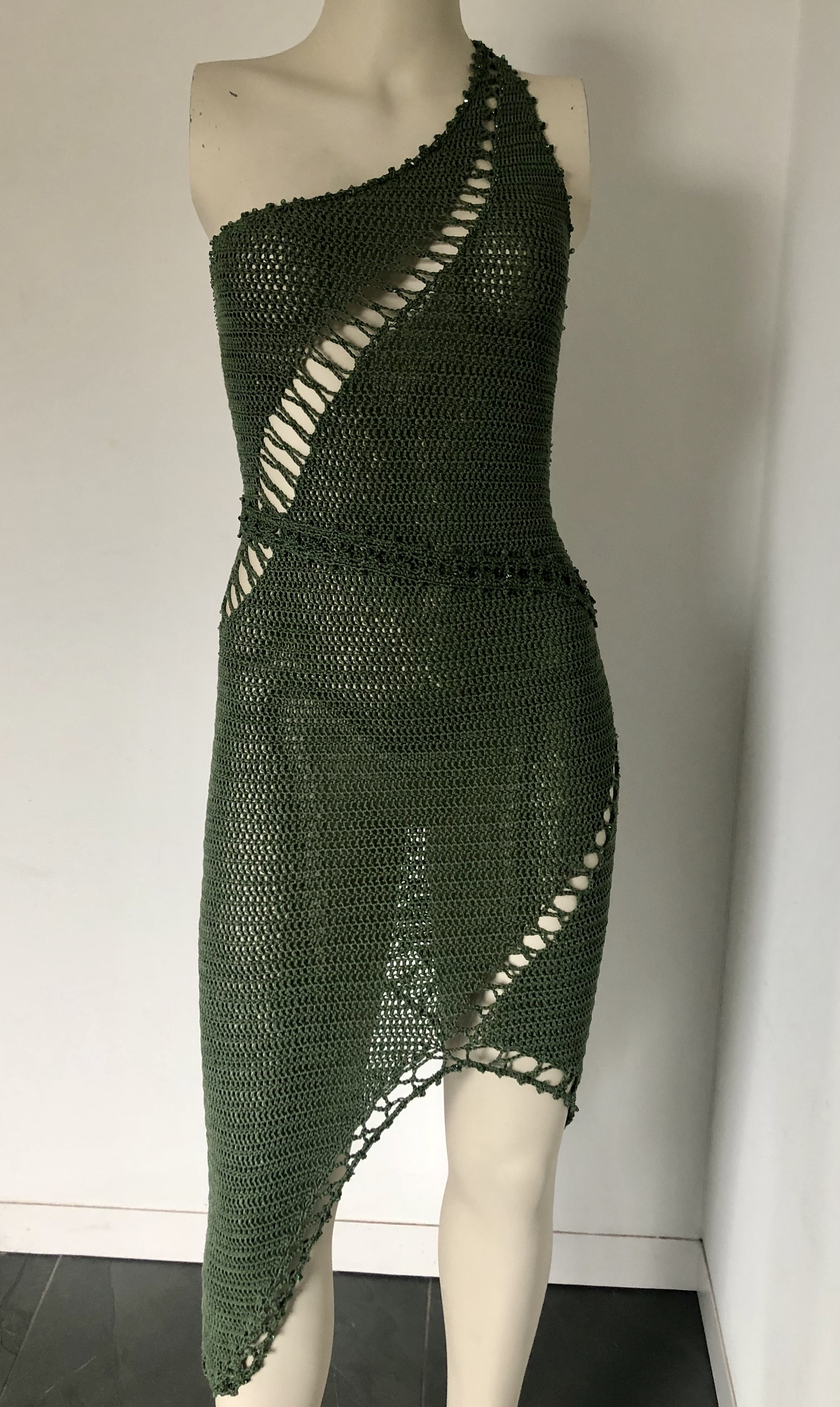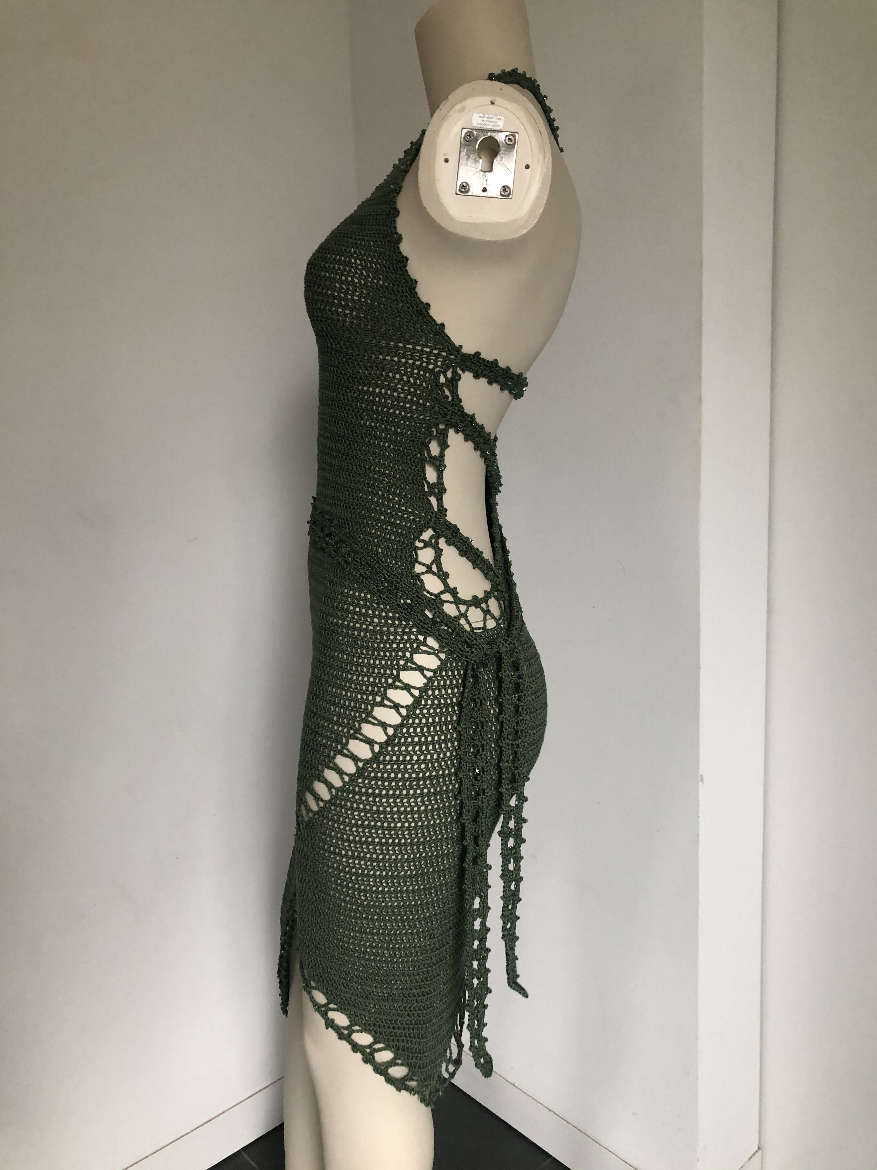 Knitted by crochet hook by hand, haute-couture silky dress in beautiful green. Knitted together with crystals swarovski and decorated with Swarovski crystal beads by hand with a natural silk germanmade thread.