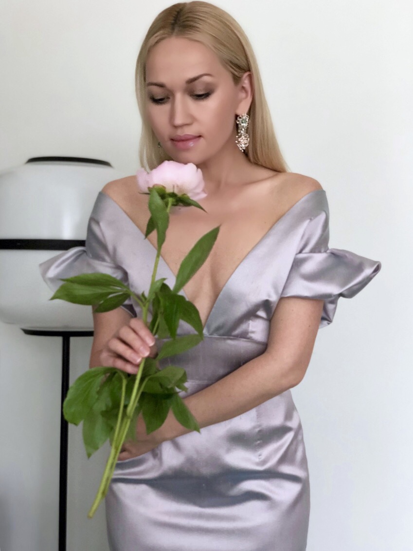 Silver midi dress, natural silk, opened back ties with the small bow on top. Bat sleeeve and 45 degree cut, possible to wear with ivory georgette silk dress underneath.