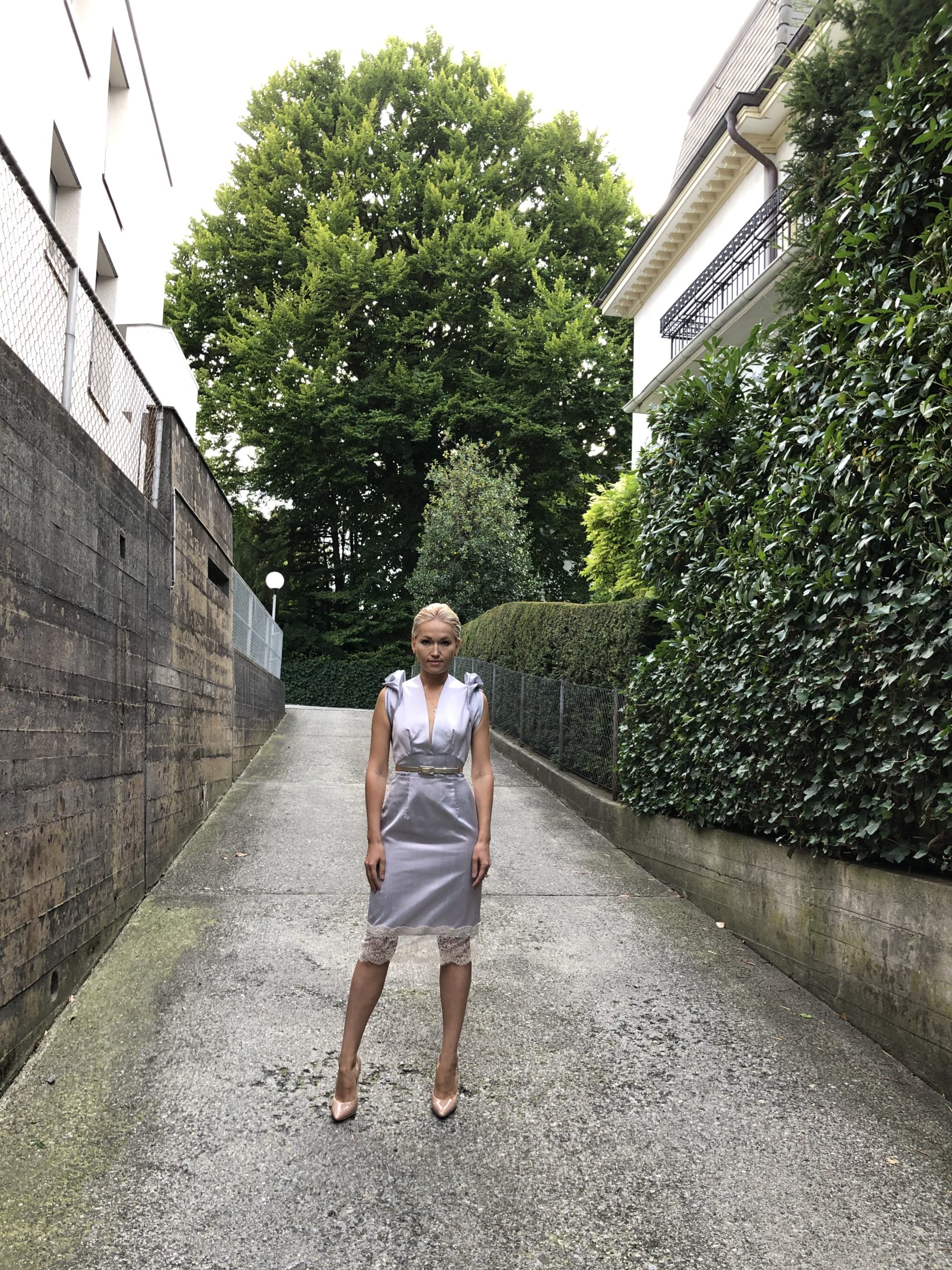 Heavy silk dress in navy blue with silver shade. Decorated with two silk bows, corded french lace with Prada motifs. Silk buttons handcrafted on the back of the skirt. Made in Switzerland.