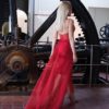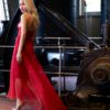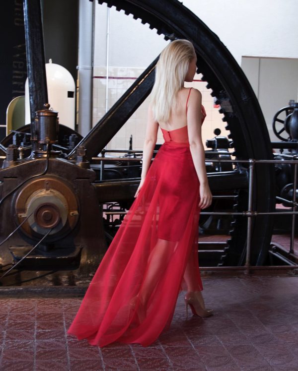 Asymmetric silk organza skirt and top in beautiful red color decorated with Swarovski buttons and leavers lace in aquarium effect. Crystals Swarovski buttons
