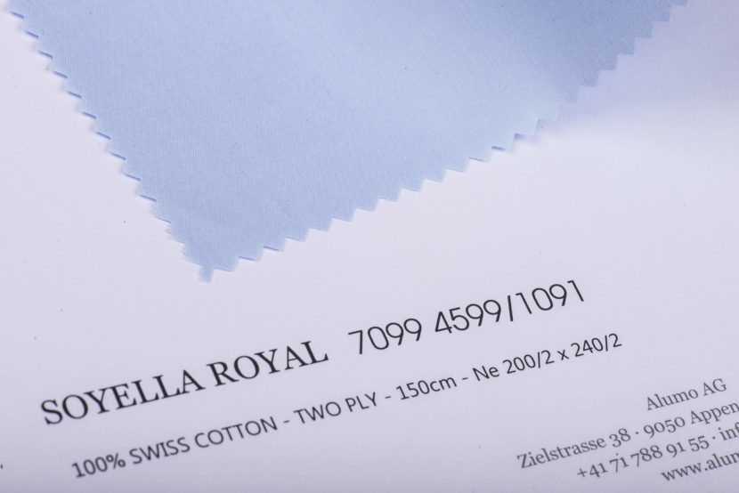 The Everest of swiss fabric selected for this shirt. The fabric used is among the most luxurious shirting available anywhere in the world. The thread count and the finesse of this fabric are so precious that the Soyella Royal is piece-dyed after weaving, and not yarn-dyed then woven like almost all other fabrics on the market. These fibers are so rare and costly that even a great producer company like ALUMO cannot afford to keep a permanent colored yarn stock. This is the reason why stripes and checks are not possible to produce.