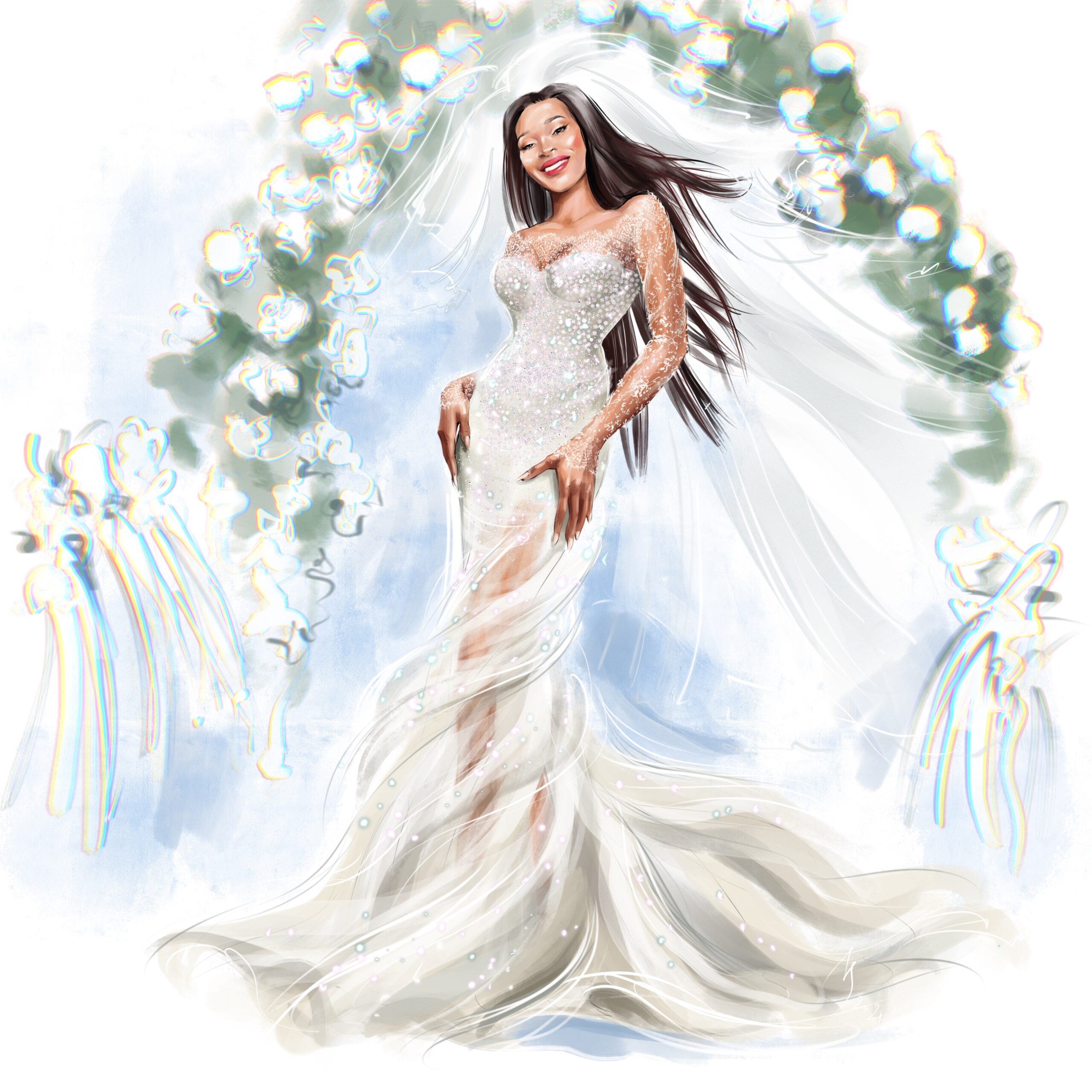 Haute-couture, hand knitted, crochet silk dress in beautiful ice-cream color, decorated with 25000 Swarovki crystals and hand knitted Sakura flowers. Copyright 2020