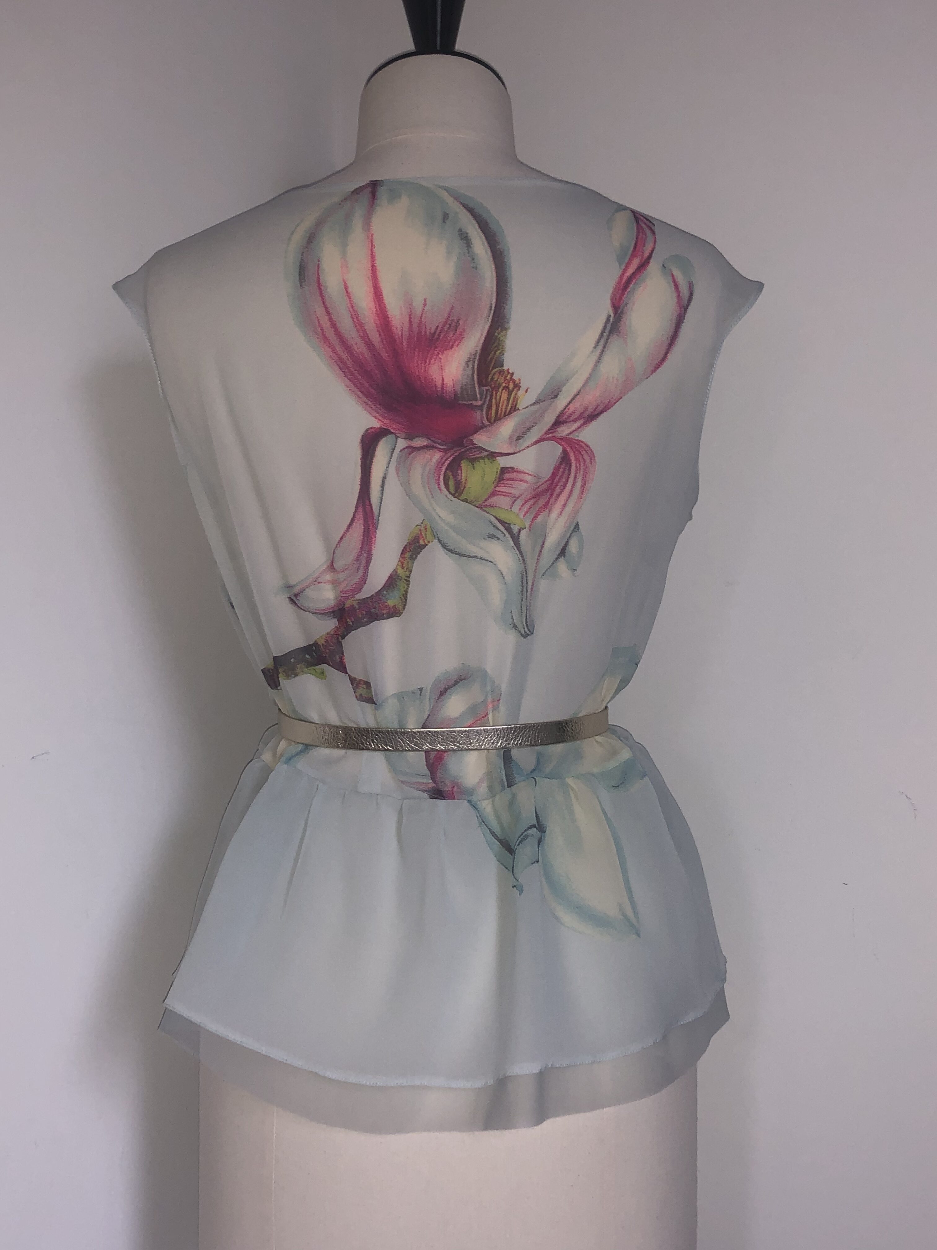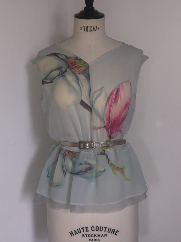 Beautiful swissmade, floral, silk georgette is used for this romantic couture top. Handcrafted in Zurich.