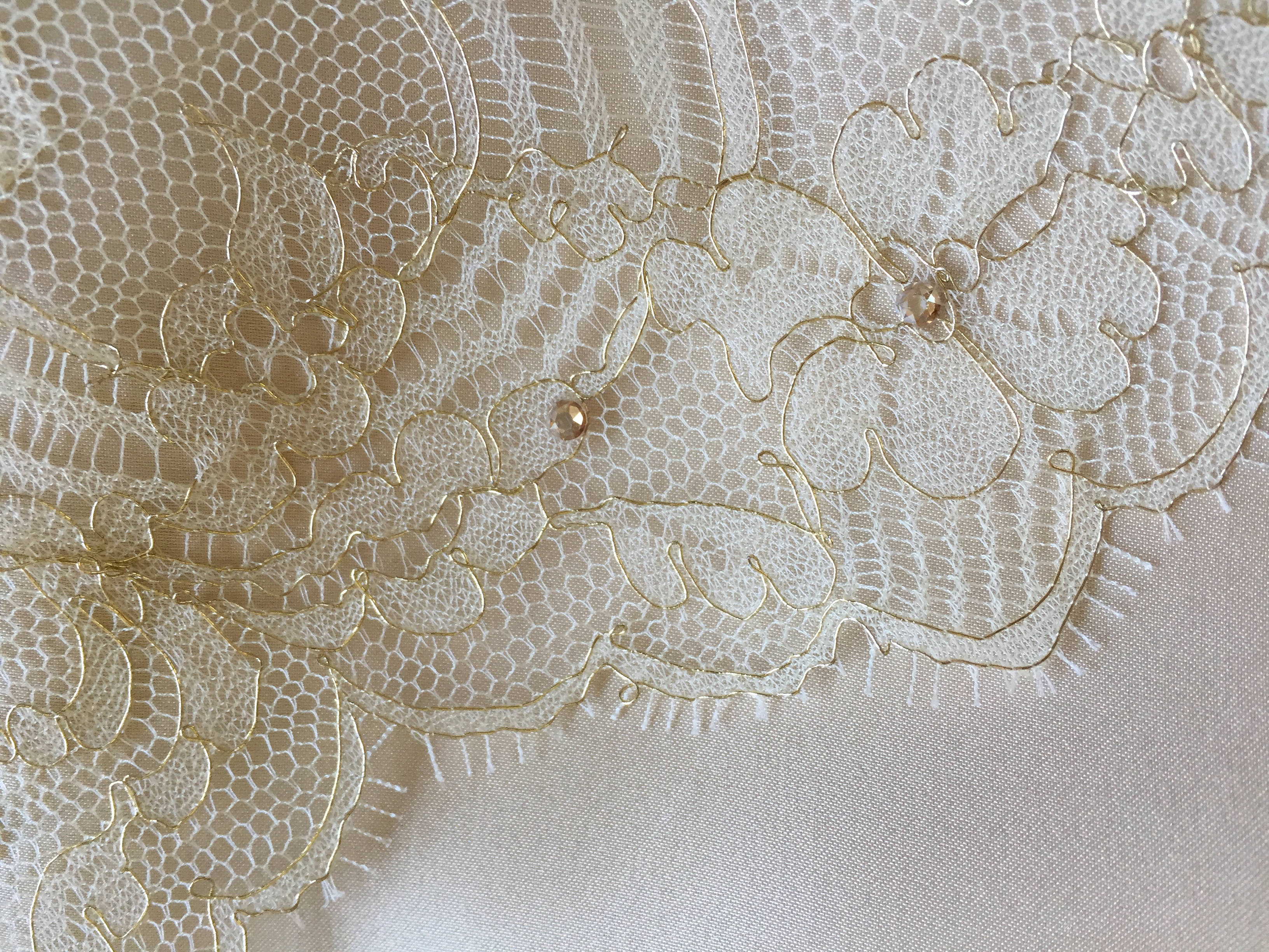 Silk wrapped buttons on the back. Double face blouse. Invisible stitching. Turtle neck. Handcrafted with precious lace. Dry clean only.