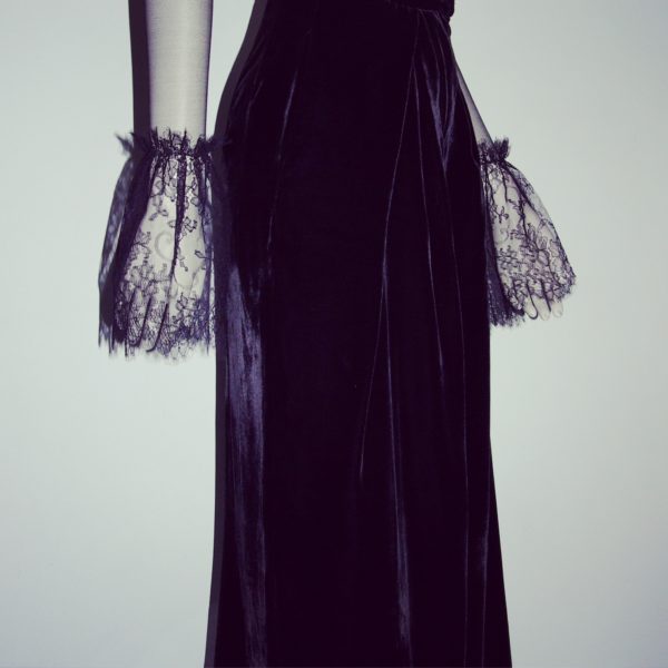 Royal blue silk satin dress with silk velvet belt, decorated with natural sapphires (4 x 22 ct each ) and my favorite precious chantilly lace. Dry clean only.
