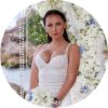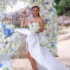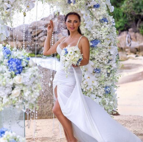 Haute-couture, hand knitted, crochet silk dress in beautiful ice-cream color, decorated with 25000 Swarovki crystals and hand knitted Sakura flowers. Copyright 2020