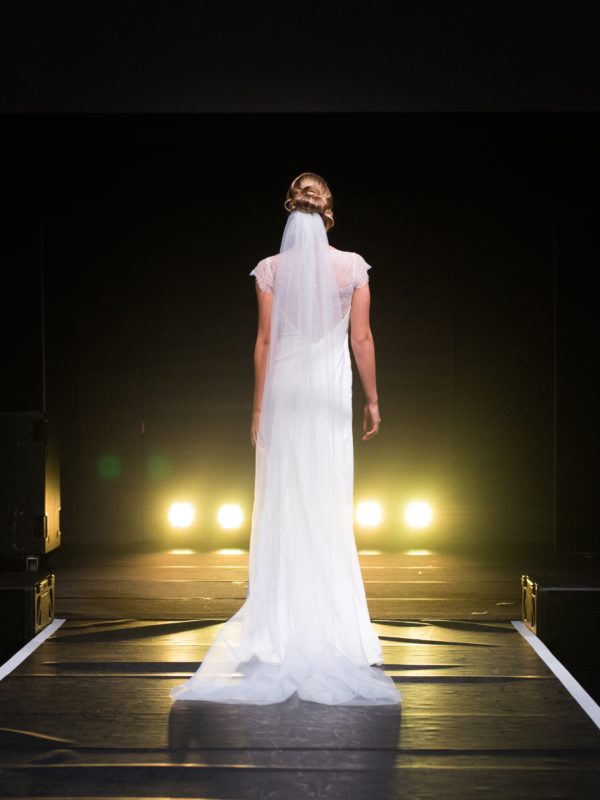 Pleaded by hand ivory silk georgette in three layers. And decorated with Swarovski xilion beads in 24 000 pieces. Soft corset. Train 1 meter. Comes with a lace veil. Dry clean only.