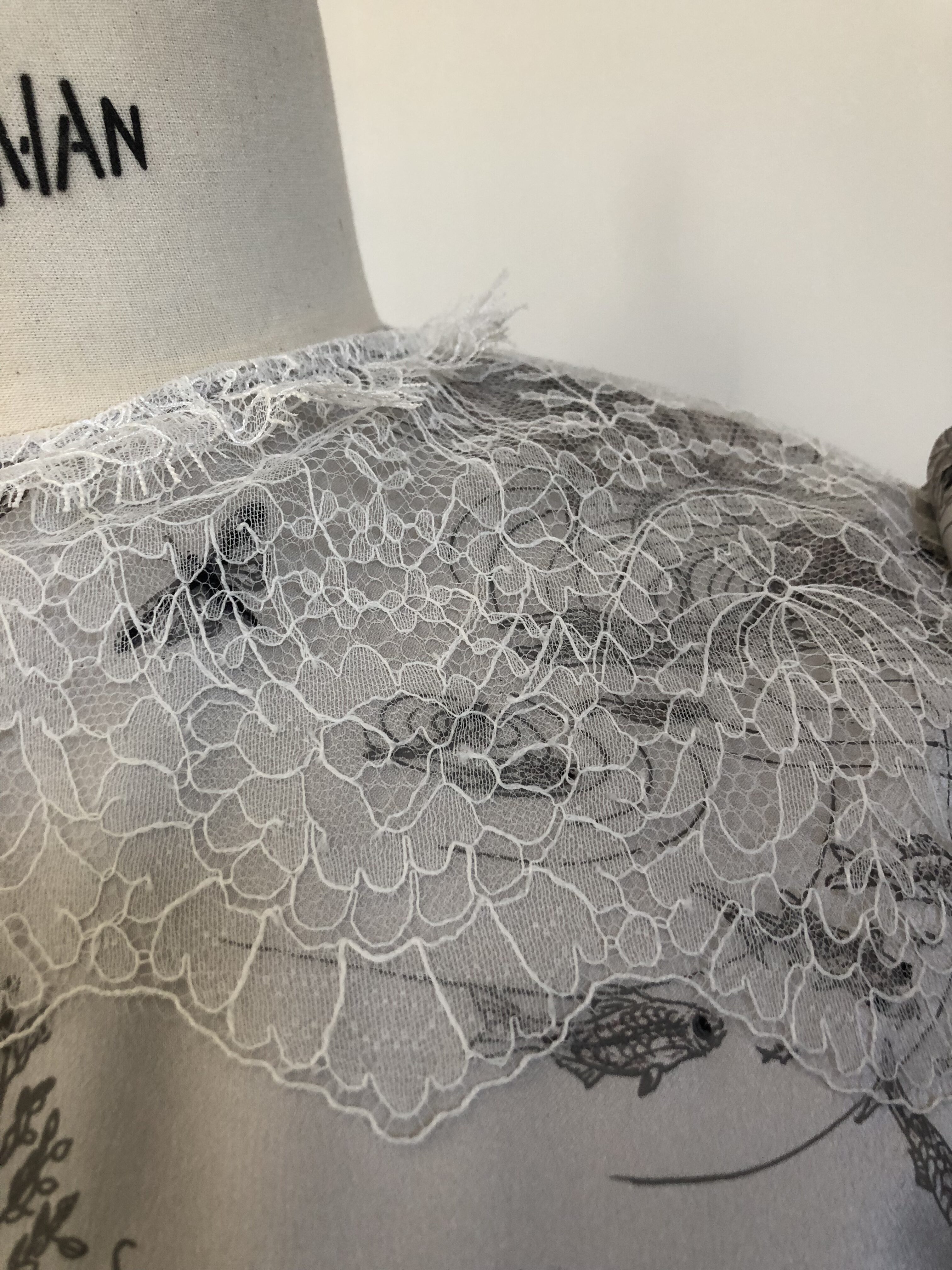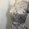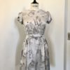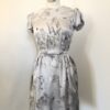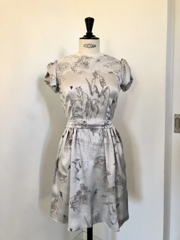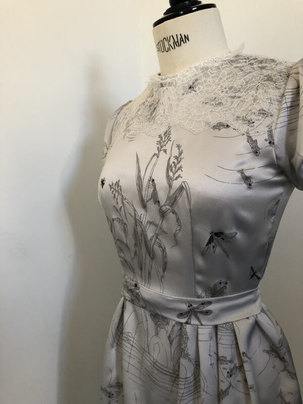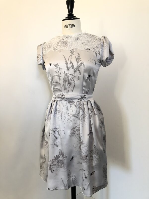 Lovely and unique “print on silk” design, 100% silk “Zurich Lake” dress with leavers lace for decor. Decorated with silk handcrafted buttons in tone with the dress. Silk wrap bow belt. Handcrafted in Zurich, Switzerland. One for the kind, unique design.