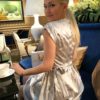 Silver midi dress, natural silk, opened back ties with the small bow on top. Bat sleeeve and 45 degree cut, possible to wear with ivory georgette silk dress underneath.