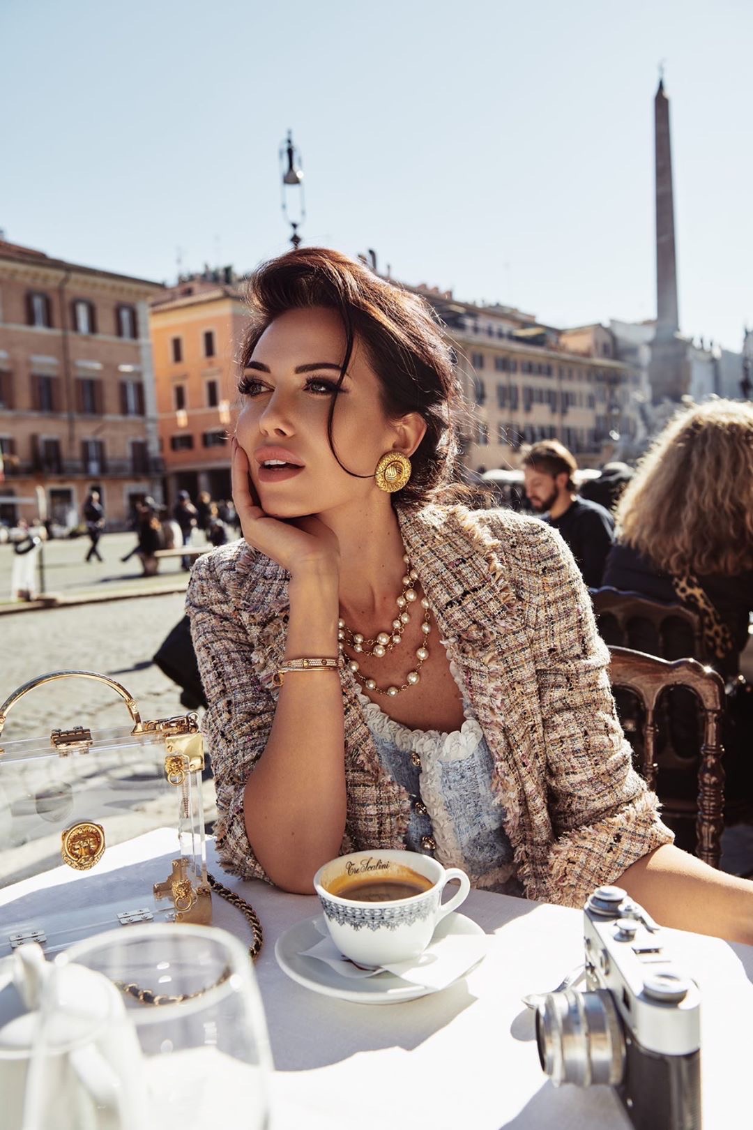 Bespoke Sparkling tweed jacket in natural wool with perlamuter and pearls. 100% silk crepe lining. Handcrafted and made in Zurich, Switzerland