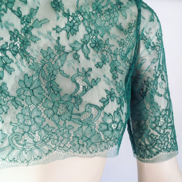 Silk wrapped buttons on the back. Double face blouse. Invisible stitching. Turtle neck. Handcrafted with precious lace. Dry clean only.