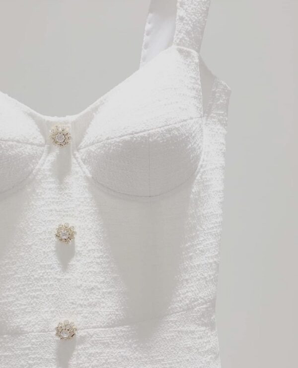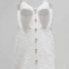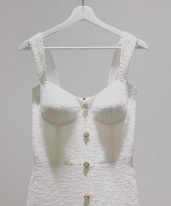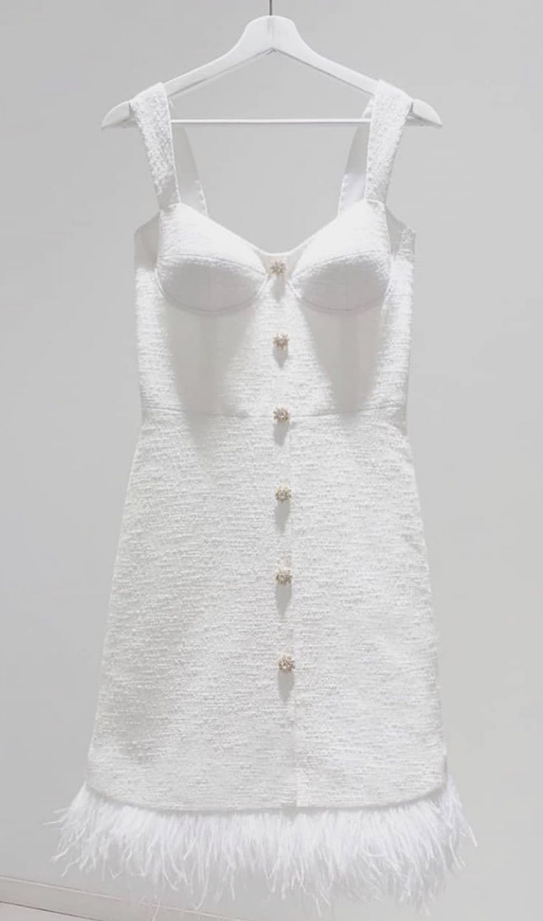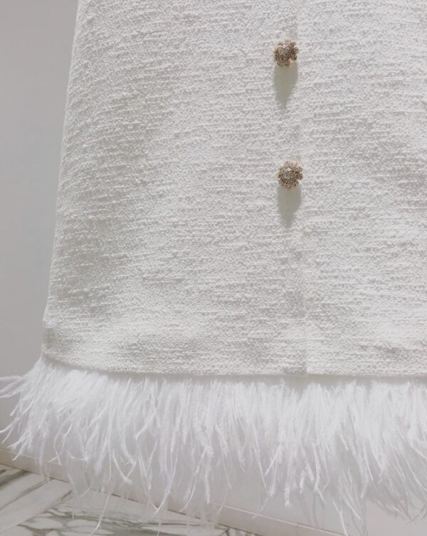 Handcrafted cocktail dress, made of sparkling natural wool italian tweed, decorated with feathers in tone and silk satin lining. Swarovski handcrafted buttons for decor.