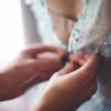Sustainable silk crepe satin in beautiful emerald color and precious french corded lace. All handcrafted with Swarovski elements and buttons.