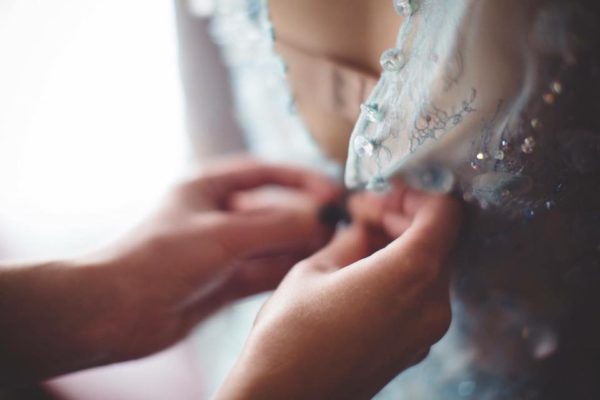 Top quality italian silk organza is used for this couture dress. Heavenly blue color of silk combined with ivory silk layers. Soft corset. Handcrafted and decorated with drops of Swarovski crystals. Dry clean only.