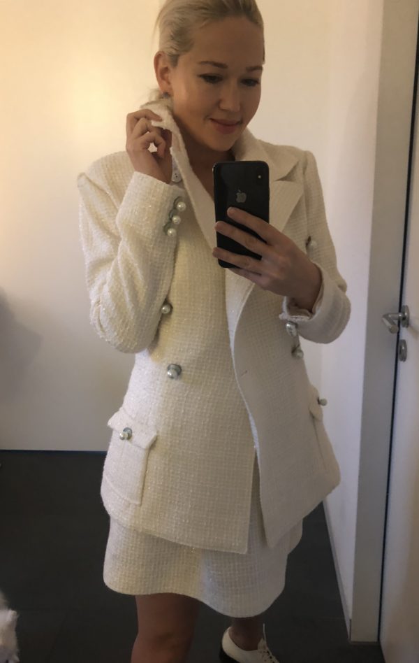 Bespoke Sparkling tweed jacket in natural wool with perlamuter and pearls. 100% silk crepe lining. Handcrafted and made in Zurich, Switzerland